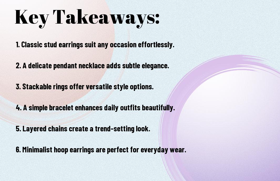 10 Timeless minimalist is what comes to mind when I think of minimalist jewelry. It’s not about the size or the number of pieces you wear, but about the quality and the statement they make. As a style expert, I believe that every woman should have a collection of minimalist jewelry that can elevate any outfit. In this blog post, I will share with you the 10 vital minimalist jewelry pieces that every woman should own, from classic stud earrings to delicate necklaces. These pieces are versatile, elegant, and perfect for any occasion. So, let’s examine the world of minimalist jewelry and discover the perfect pieces to add to your collection.